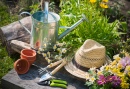 Gardening Tools and A Straw Hat On the Grass In the Garden